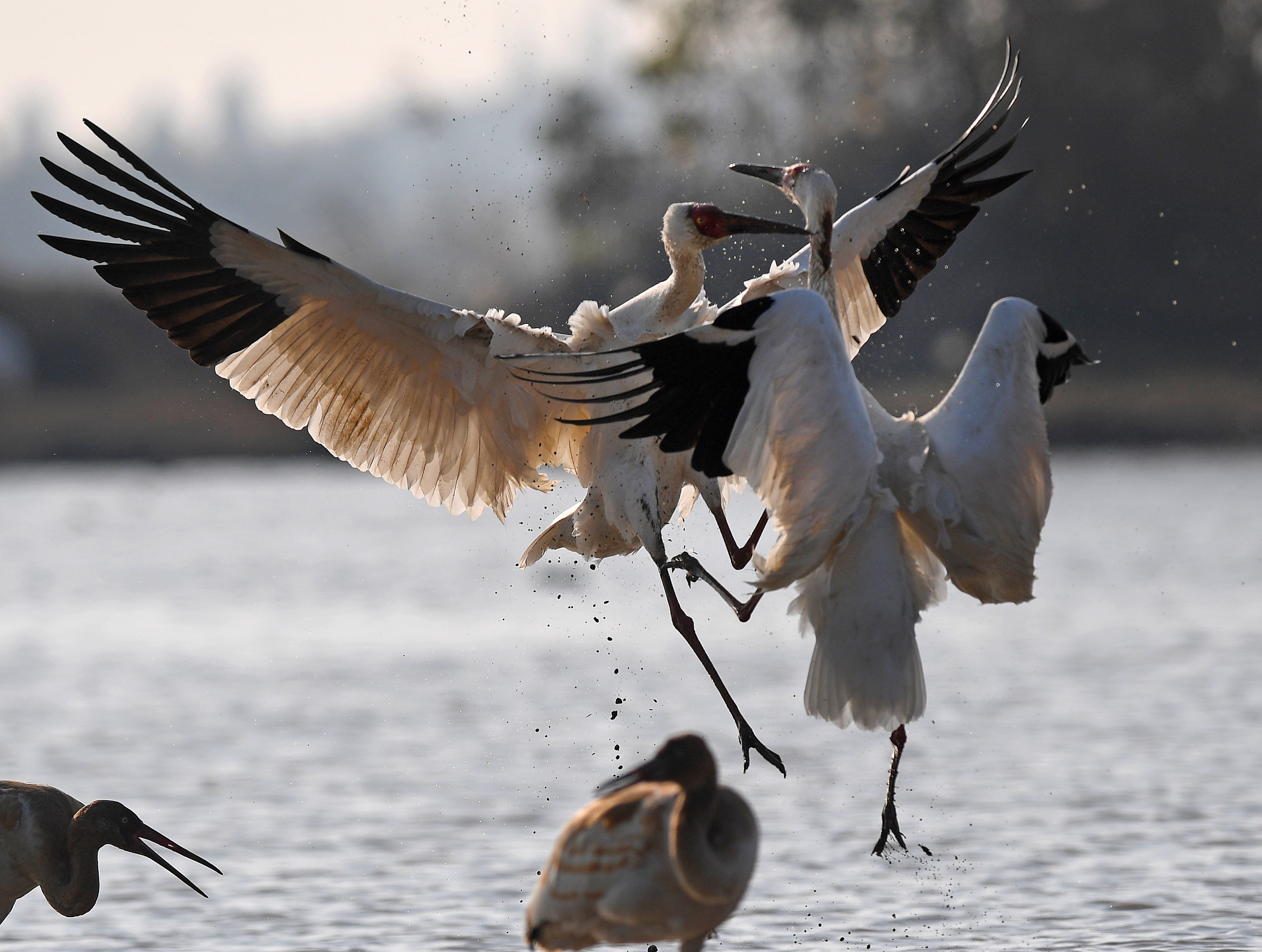 白鹤在位于鄱阳湖湖区的南昌五星白鹤保护小区的湿地中栖息觅食。(2020年12月21日摄) 新华社记者 万象摄