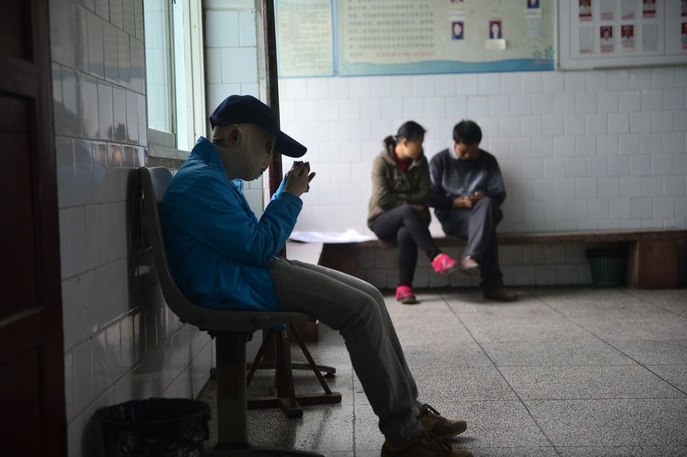 ↑周涛正在医院里等待上药。刚开始,戴着面具面对陌生人往往是最难熬的时刻(2014年11月29日摄)。