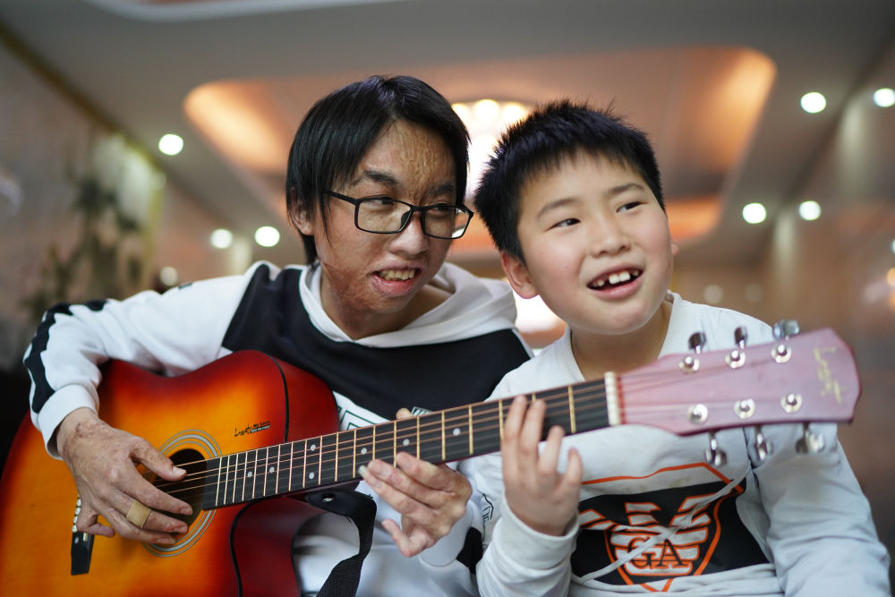 ↑周涛和弟弟一起弹吉他唱歌。进入高中后,周涛能脱下面具生活了(2020年4月29日摄)。