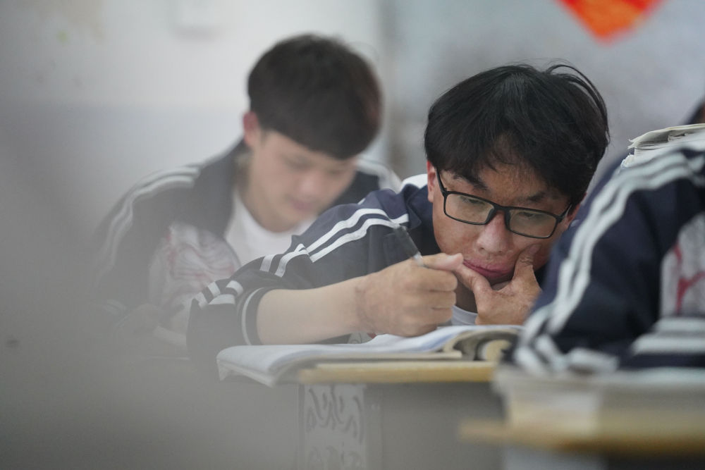 ↑周涛正在教室里复习功课(2021年6月3日摄)。