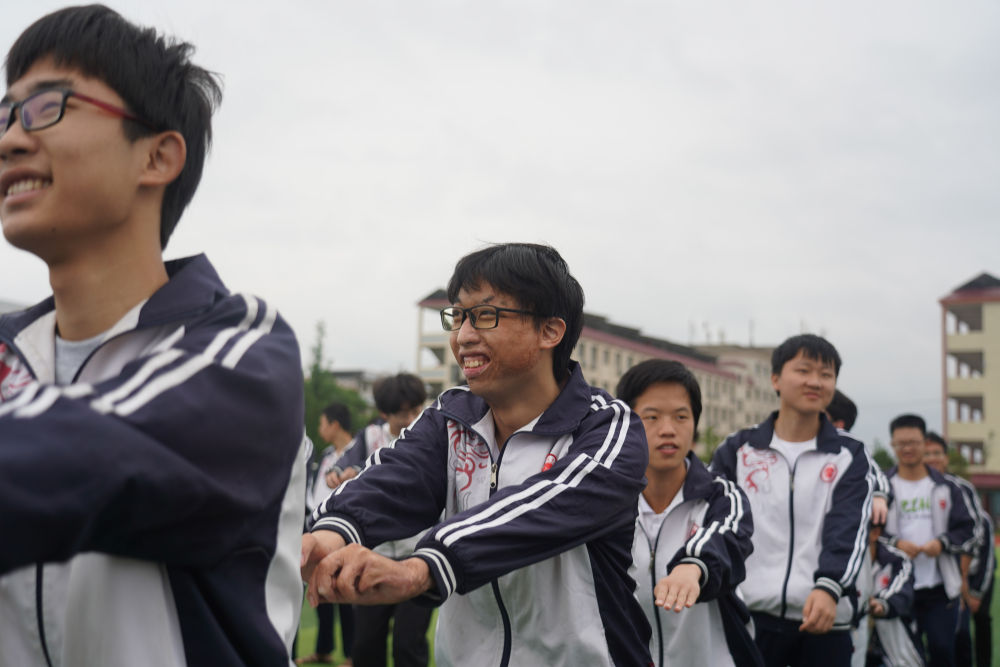↑周涛与同学们参加学校组织的高考前减压游戏活动(2021年6月4日摄)。
