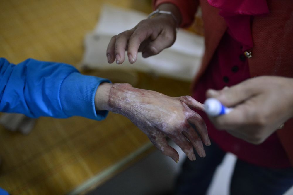 ↑周涛的妈妈正在给周涛上药(2014年11月5日摄)。