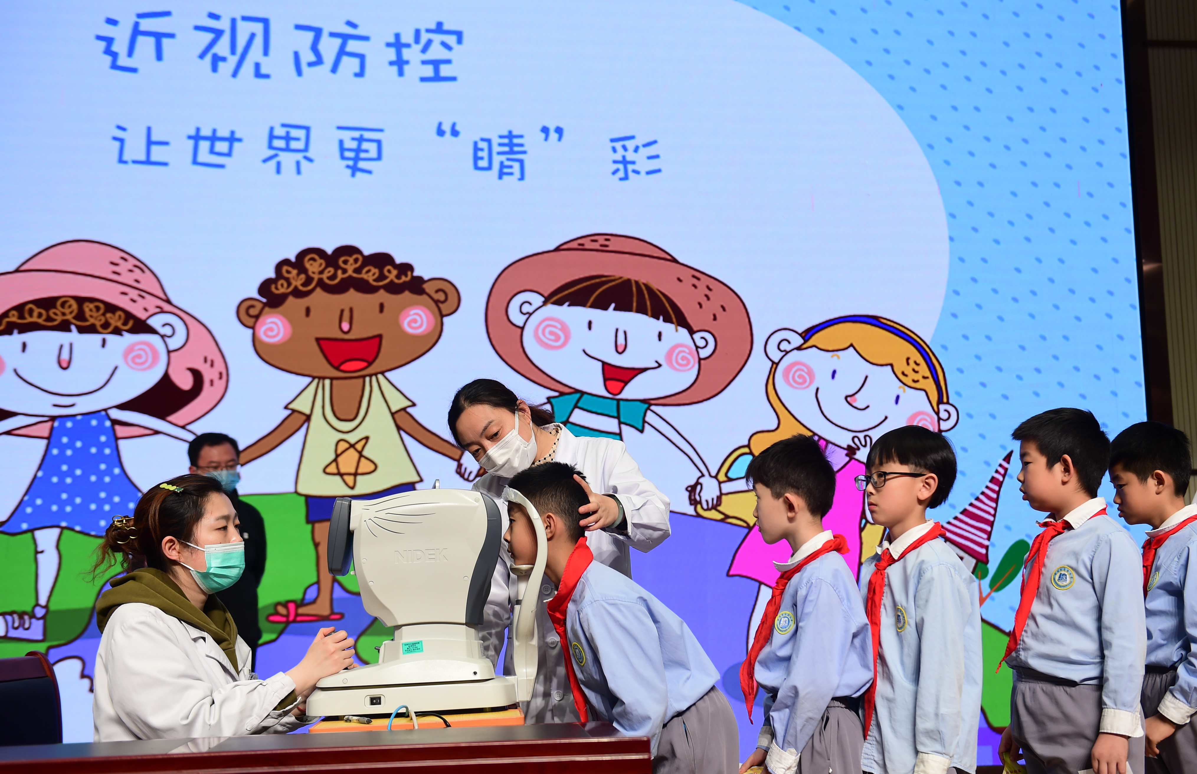 3月22日,在河北沧州市实验小学,医生志愿者为学生进行医学验光。新华社发(傅新春 摄)