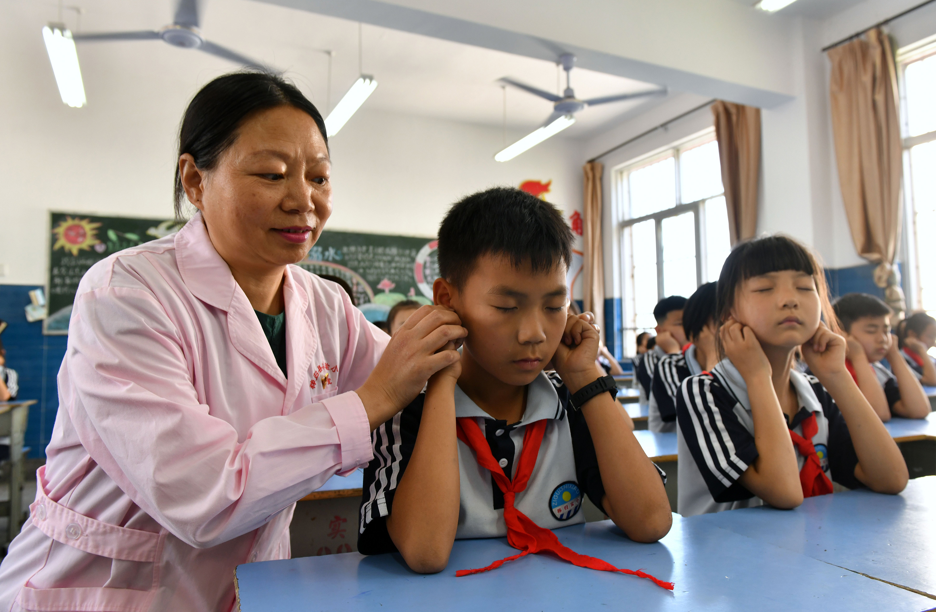 6月4日,在湖北省宜昌市秭归县实验小学,医务人员指导学生做眼保健操。今年6月6日是第26个全国爱眼日,各地学校举行多种活动指导孩子们从小养成爱眼护眼的习惯。新华社发(王辉富 摄)