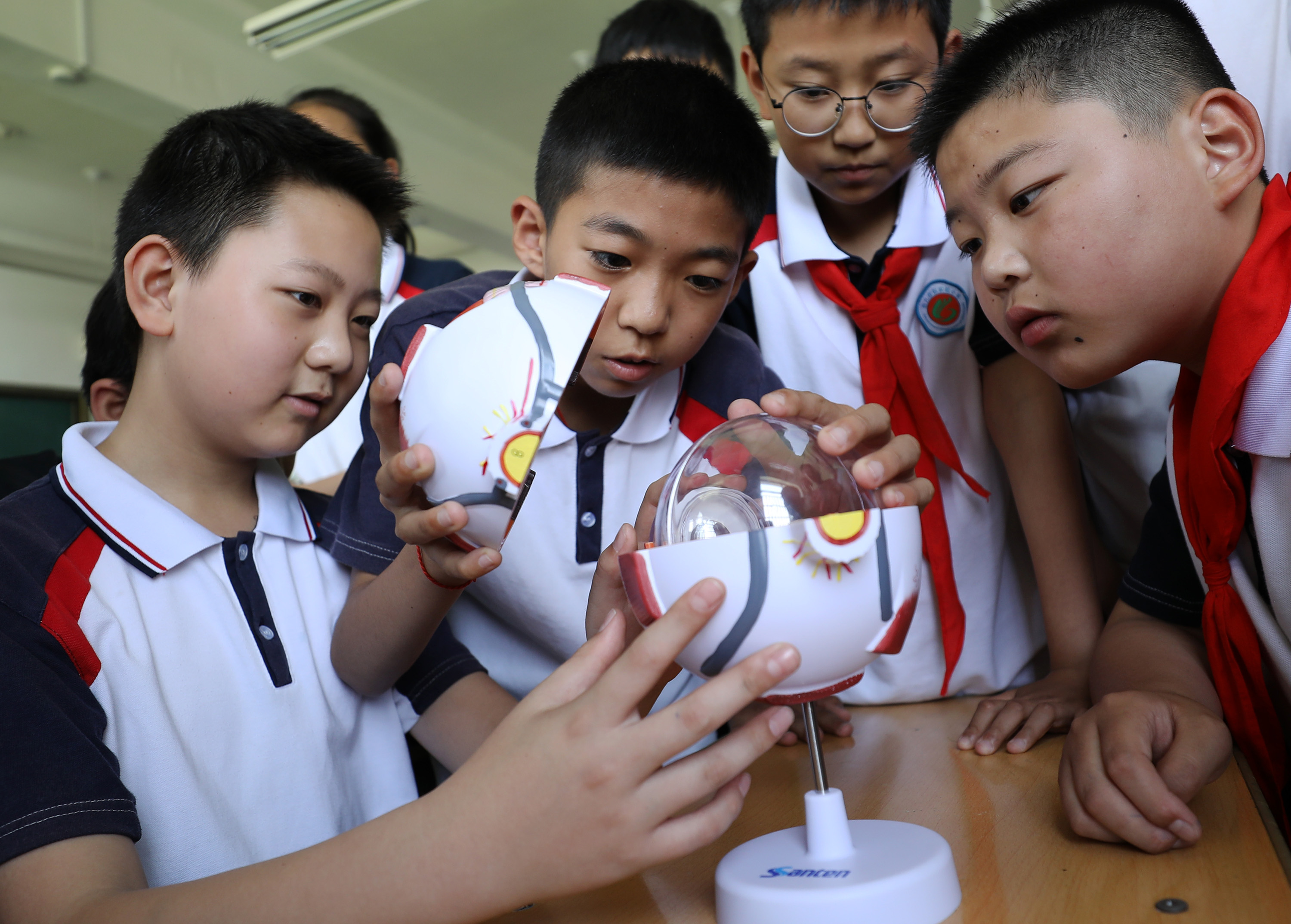 6月4日,在山东省枣庄市台儿庄区实验小学,学生通过动手组装眼球模型来了解眼球构造。今年6月6日是第26个全国爱眼日,各地学校举行多种活动指导孩子们从小养成爱眼护眼的习惯。新华社发(张严新 摄)