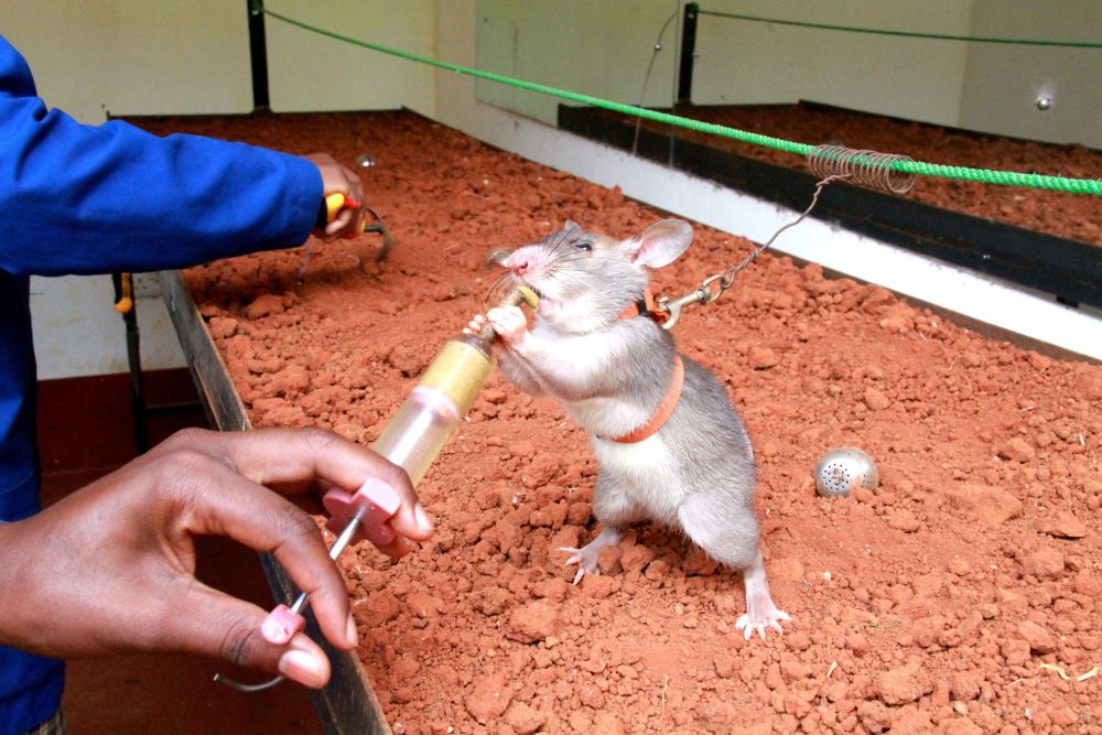 不少啮齿类动物能在食物奖励下嗅出指定气味,而非洲巨颊囊鼠最适合探雷。相比其他鼠类,它们寿命较长,能活到8岁左右,体形大小也适宜在雷区活动而不会引爆爆炸物。