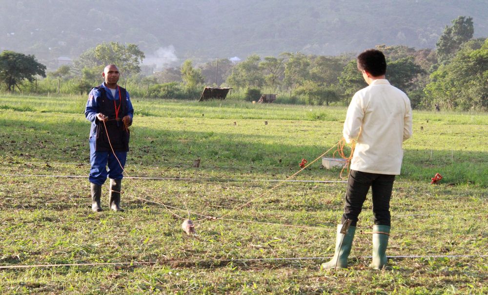 2018年3月23日,在坦桑尼亚莫罗戈罗省,来自阿波波研究机构的工作人员在训练非洲巨颊囊鼠扫雷。(新华社记者李斯博摄)
