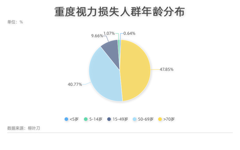 重度视力损失人群中,50-69岁和70岁以上人群仍是主要群体,分别占到了重度视力损失人群的40.77%和47.85%。