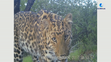 不仅路上经常出现华北豹的爪印,安装在道路旁的监控也显示,华北豹在这里“通行率”极高。它们有时“拖家带口”结伴而行;有时“闲庭信步”,意态悠闲。