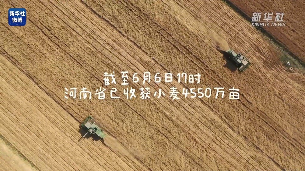 #大国粮仓奏响夏收交响曲#【#河南麦收会战正酣#】眼下,冬小麦主产区河南省的麦收“会战”进入高峰。大型收割机械穿梭来往,隆隆轰鸣汇成一首夏收交响曲。截至6月6日17时,河南省已收获小麦4550万亩,占全省种植面积的53.5%。戳视频,感受大国粮仓奏响的夏收交响曲。 新华社的微博视频