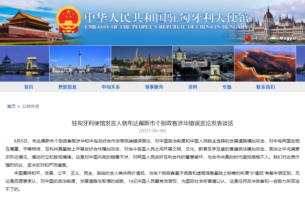 6月5日,匈牙利布达佩斯市个别政客就涉华和中匈友好合作发表极端错误言论,对中国政治制度和中国人民自主选择的发展道路横加攻击,对中匈两国在相互尊重、平等相待、互利共赢基础上开展友好合作横加攻击,对当今各国人民之间开展文明、文化、教育互学互鉴的普遍做法横加攻击,言谈之中充满意识形态偏见,煽动对立和敌视情绪。这是对中国内政的粗暴干涉,对两国人民友好互利合作的蓄意破坏,与合作共赢的时代潮流格格不入。我们对此表示强烈抗议、坚决反对和严厉谴责。