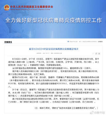 截至6月6日24时,据31个省(自治区、直辖市)和新疆生产建设兵团报告,现有确诊病例403例(其中重症病例10例),累计治愈出院病例86228例,累计死亡病例4636例,累计报告确诊病例91267例,现有疑似病例2例。累计追踪到密切接触者1030389人,尚在医学观察的密切接触者8509人。
