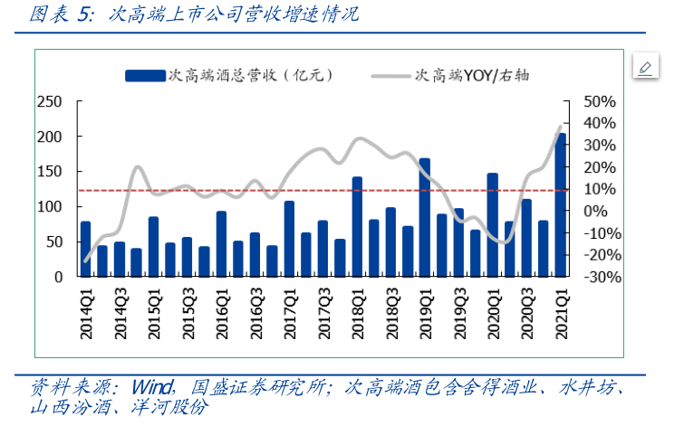此外,伴随着消费的快速升级,次高端酒产品也将持续受益。其中,具备业绩弹性及经营持续改善的公司近期特别受到市场关注。今年以来次高端强势反弹,青花汾酒、水井坊、舍得等多品牌2021年一季度营收同比翻倍,开启新一轮发展周期。国盛证券指出,作为白酒行业中的“成长型”,次高端的竞争格局仍未固化,目前呈现了多强并立的局面。展望未来5年,行业扩容至千亿规模,仍有望形成2-3个百亿大单品。