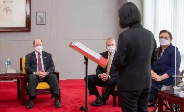据路透社报道,蔡英文6日上午在台北松山机场与美国三名参议员见面。(图据环球网)