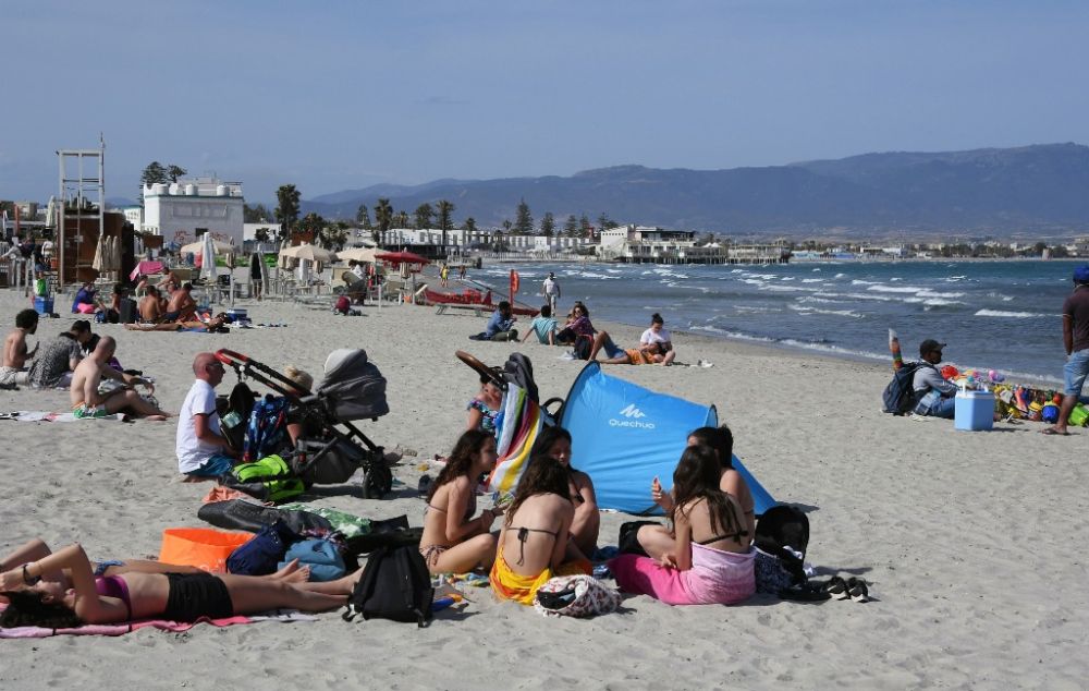 5月28日,人们在意大利撒丁岛卡利亚里的海边休闲。(新华社发,阿尔贝托·林格利亚摄)