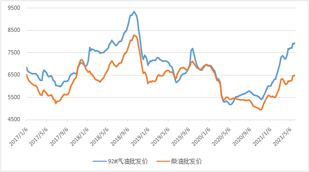 中国汽柴油批发价格周度均价走势图(单位:元/吨)
