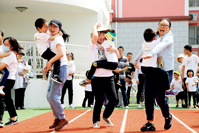 5月30日,江苏省连云港市海州区一所幼儿园,家长与小朋友们一起进行亲子趣味游戏 王春摄 / 本刊