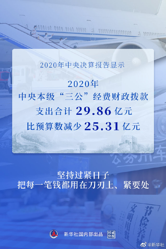 受国务院委托,财政部部长刘昆7日向十三届全国人大常委会第二十九次会议作2020年中央决算的报告。根据报告,2020年,中央本级“三公”经费财政拨款支出合计29.86亿元,比预算数减少25.31亿元。主要是中央部门落实过紧日子要求,厉行节约,以及客观因素导致部分公务活动减少。(记者申铖;海报设计杨轶群)