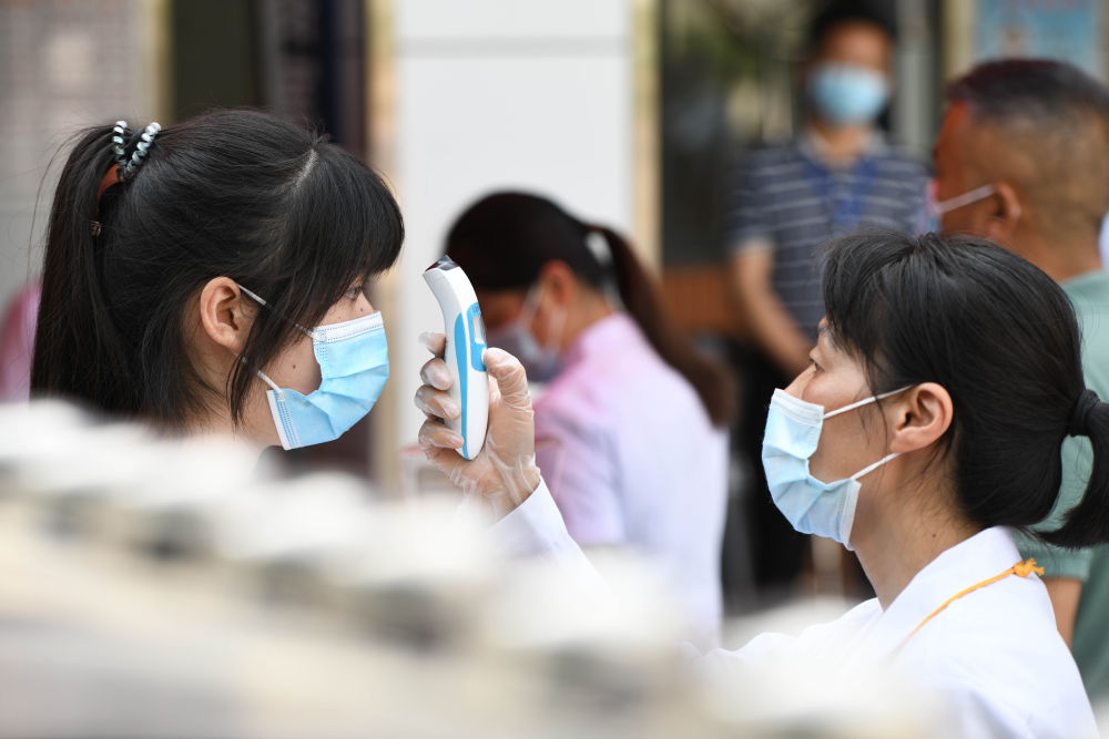 ↑6月7日,在广西大化瑶族自治县高级中学校舍前,医务人员给考生测体温。新华社记者 张爱林 摄