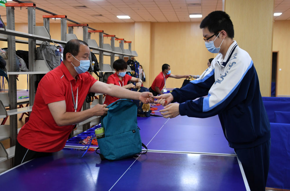 ↑6月7日,在中国农业大学附属中学考点,高考考生(右)在存包处存包。新华社记者 任超 摄