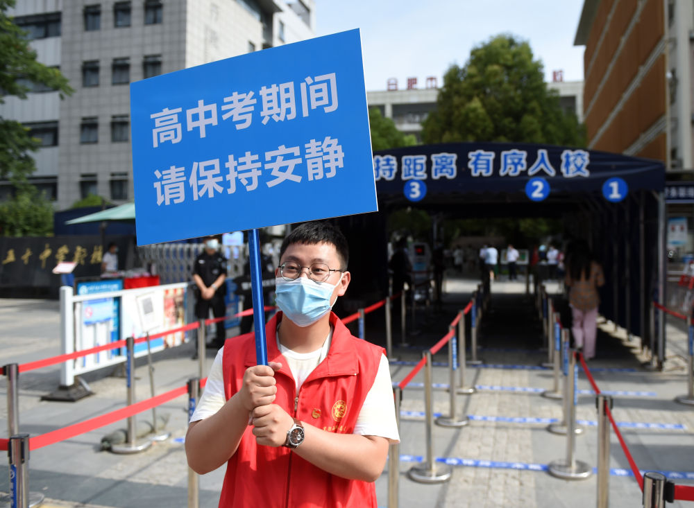 ↑6月7日,在安徽省合肥市五十中学天鹅湖校区考点,志愿者在考场外维持秩序。新华社记者 周牧 摄