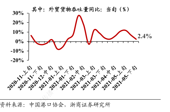 进口持续高景气态势下,外贸集装箱吞吐量今年以来持续保持高增长。中国港口协会5月份重点监测数据显示,港口吞吐量保持较快增长。分业务板块来看,集装箱方面,八大枢纽港口集装箱吞吐量较2020年5月增长11%,较2019年同期增长7%。5月份外贸箱量同比增长14%,内贸增长3%。同时,近期外贸需求的持续旺盛也使得集装箱舱位及空箱紧缺状况有所反弹。价格方面,去年上半年约1600美元的20英尺小箱价格,如今已经翻倍涨到3600美元。热门的40英尺箱价格也已涨到5950美元。