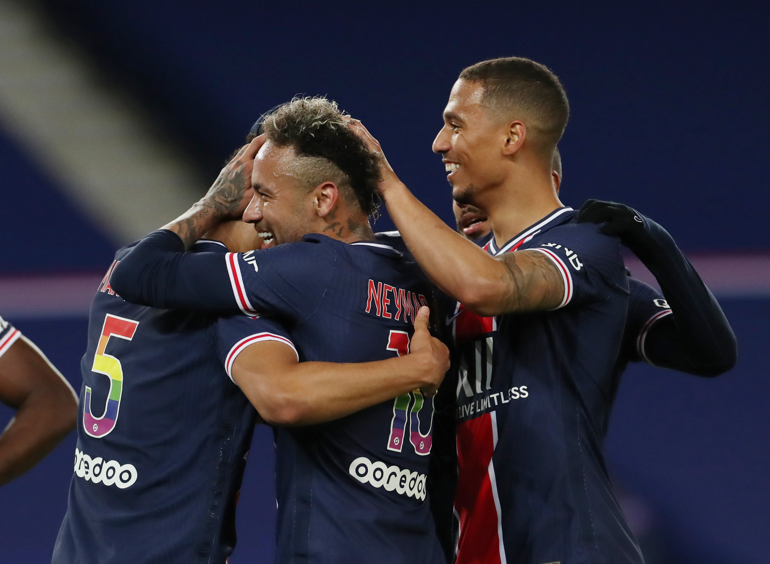 5月16日,法甲巴黎圣日耳曼队球员在对阵兰斯的比赛中庆祝进球。新华社记者高静摄