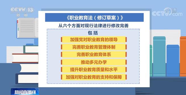 《职业教育法(修订草案)》共8章58条,新增3章18条,聚焦职业教育领域热点难点问题,主要从6个方面对现行法律进行修改完善,包括:加强党对职业教育的领导,完善职业教育管理体制,完善职业教育体系,推动多元办学,提升职业教育质量和水平,加强对职业教育的支持和保障。
