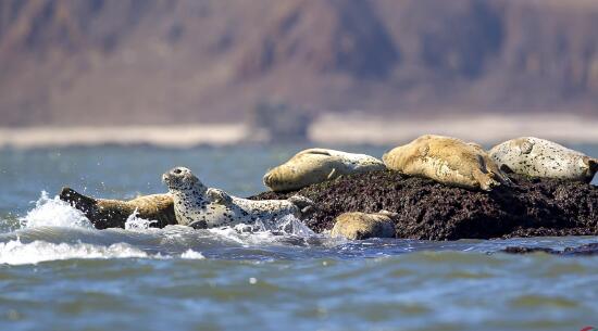 眼下正是斑海豹的洄游季,山东长岛海域是它们洄游的必经之地。眼前的这两块平坦光滑的礁石,就是斑海豹们临时“歇脚”的地方,它们眯着眼睛,打着哈欠,伸着懒腰,趴在礁石上享受“日光浴”,时不时还会跳进海里美餐一顿。