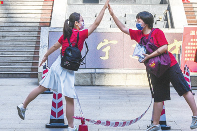 广西南宁市第二中学新民校区考点,老师(左)与考生击掌。新华社记者 曹祎铭摄