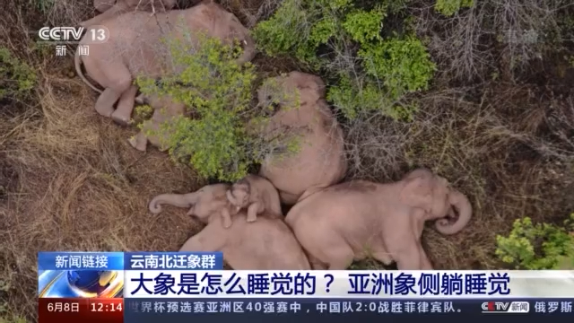 为了同时监测象群和离群的公象,现场指挥部同时对两个点位开展监测布防,工作人员还拍摄到了亚洲象躺下睡觉的画面,象群集体休息,为了保护幼象安全,小象被夹在中间。为了不打扰象群,它们睡觉时,尽量将无人机调至可以监测到它们的最高位置,远远观察。