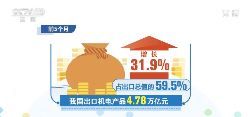 国家海关总署最新统计数据显示,1—5月份我国累计出口同比增长40.2%。其中,以机电产品为代表的高技术含量商品的出口占比较大。前5个月,我国出口机电产品4.78万亿元,增长31.9%,占出口总值的59.5%。