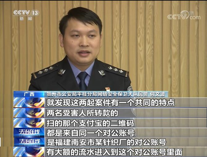 贺州市公安局平桂分局刑事侦查大队副大队长 刘龙伟:(犯罪嫌疑人)对受害者进行敲诈之后还语言威胁,就是说你的视频还保留几个月,如果这几个月发现你报案了,会把你的视频发给你的亲朋好友的,我希望你不要报案,这也是一个威胁,然后我们辖区这两个受害者还是选择了过来报案。通过调查,警方发现这两起案件除了作案手法如出一辙外,就连转账付钱的账号也一模一样。