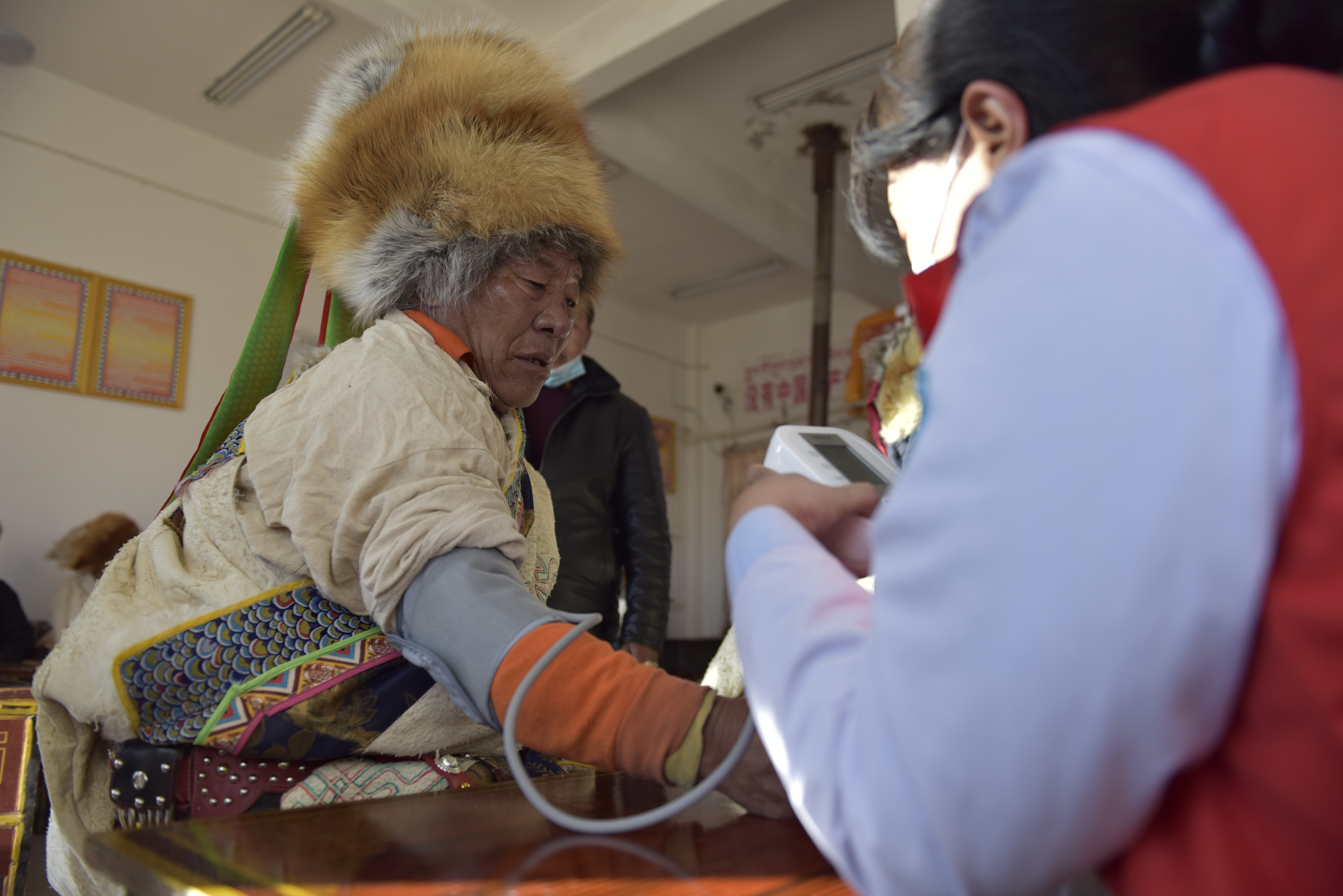 尼玛县新时代文明实践中心志愿者给次仁扎西量血压。新华社记者 格桑朗杰 摄