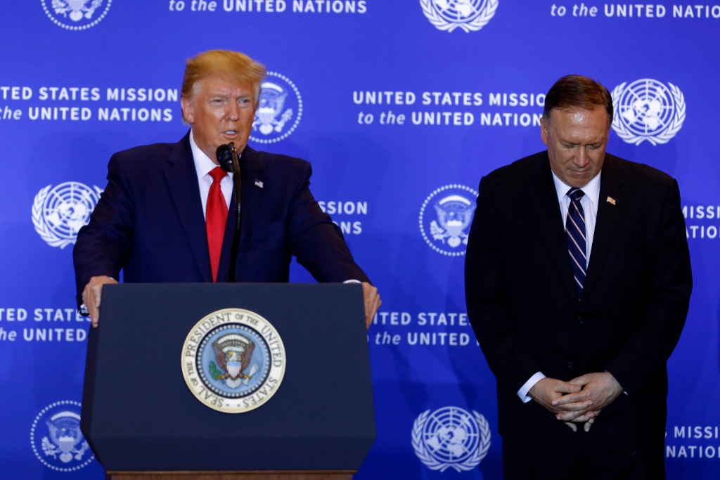 2019年9月25日,在美国纽约,时任美国总统特朗普(左)和时任国务卿蓬佩奥出席新闻发布会。(新华社记者李木子摄)