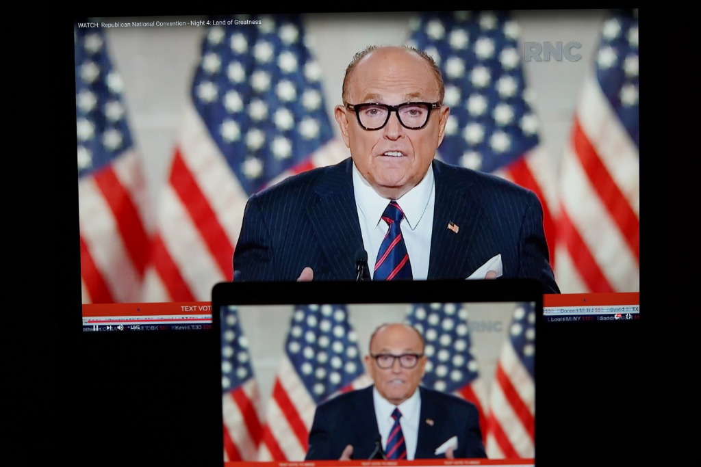 2020年8月27日拍摄的视频画面显示,美国纽约前市长鲁迪·朱利安尼在共和党全国代表大会上讲话。(新华社记者刘杰摄)