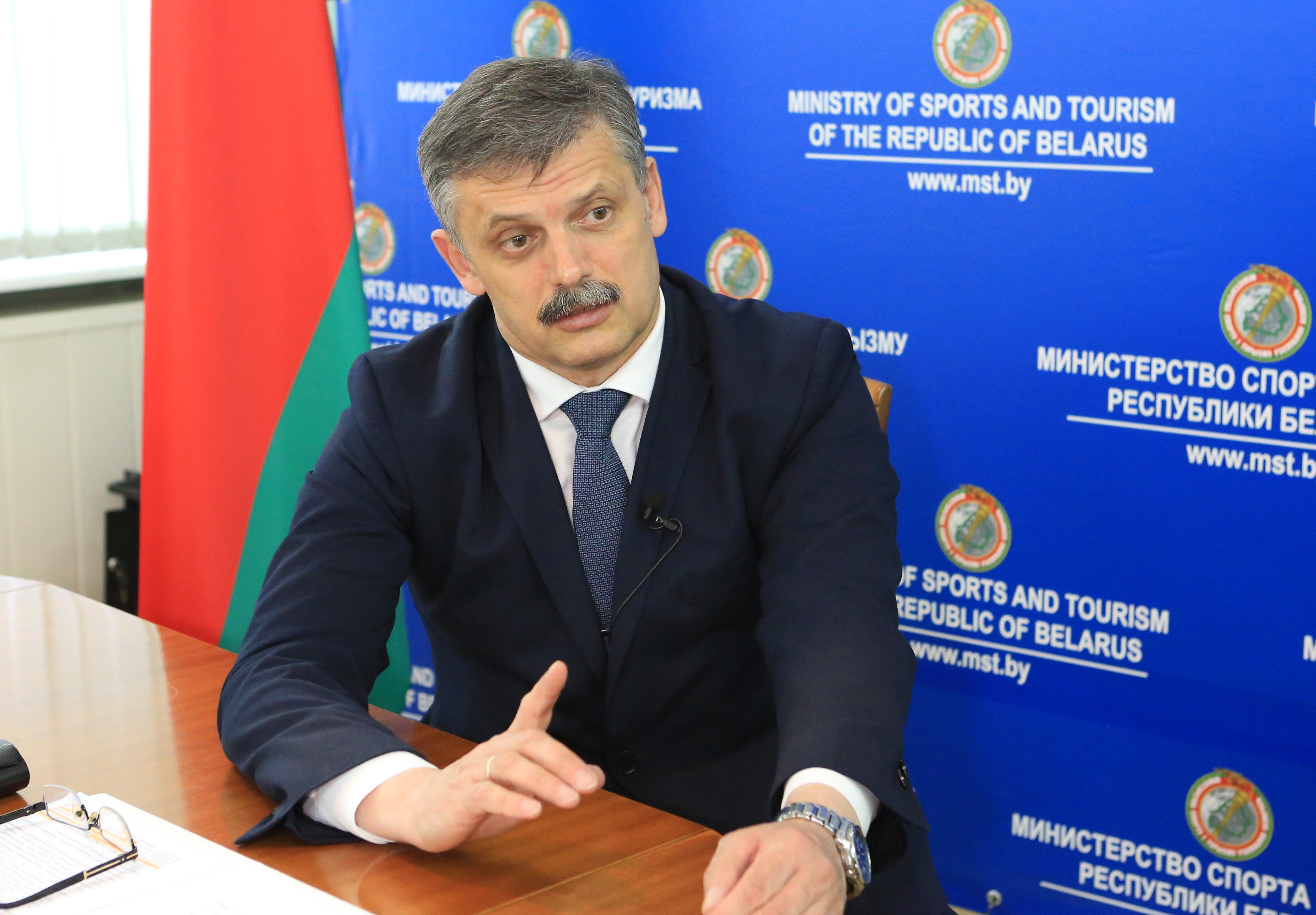 5月27日,白俄罗斯体育与旅游部长谢尔盖·科瓦利丘克接受新华社记者专访。新华社发任科夫摄