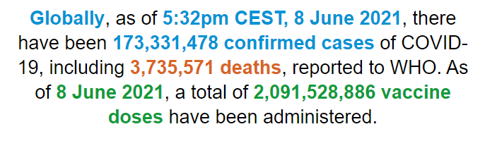 根据世卫组织最新实时统计数据,截至欧洲中部夏令时间6月8日17时32分(北京时间6月8日23时32分),全球累计新冠肺炎确诊病例173331478例,累计死亡病例3735571例。8日全球新冠肺炎确诊病例新增308911例,死亡病例新增7801例。(总台记者 朱赫)