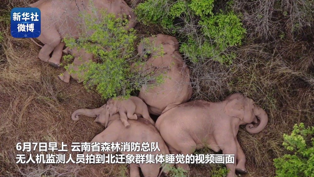 #母象睡觉时是这样保护小象的#【#北迁象群超萌睡姿视频来了#】日前,云南省森林消防总队的无人机监测人员观测到北迁象群集体睡觉的视频画面,很多网友之前看到图片就大喊“太萌”,新华社记者拿到了这一组高清视频,快来看看。#你知道大象怎么睡觉吗#(记者:孙敏、赵珮然、胡超) 新华社的微博视频