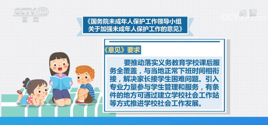 《意见》要求,要推动落实义务教育学校课后服务全覆盖,与当地正常下班时间相衔接,解决家长接学生困难问题。引入专业力量参与学生管理和服务,有条件的地方可通过建立学校社会工作站等方式推进学校社会工作发展。