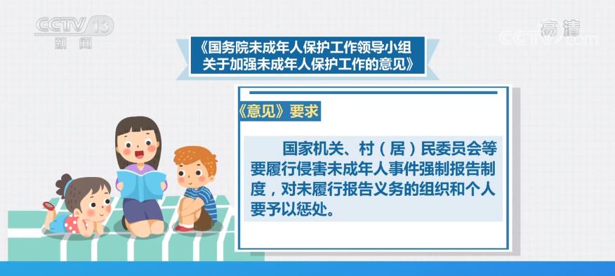央视网消息:《国务院未成年人保护工作领导小组关于加强未成年人保护工作的意见》要求加强学校保护工作,整合完善学校保护制度体系,落实侵害未成年人事件强制报告制度,并且推动制定未成年人网络保护行业规范和行为准则。