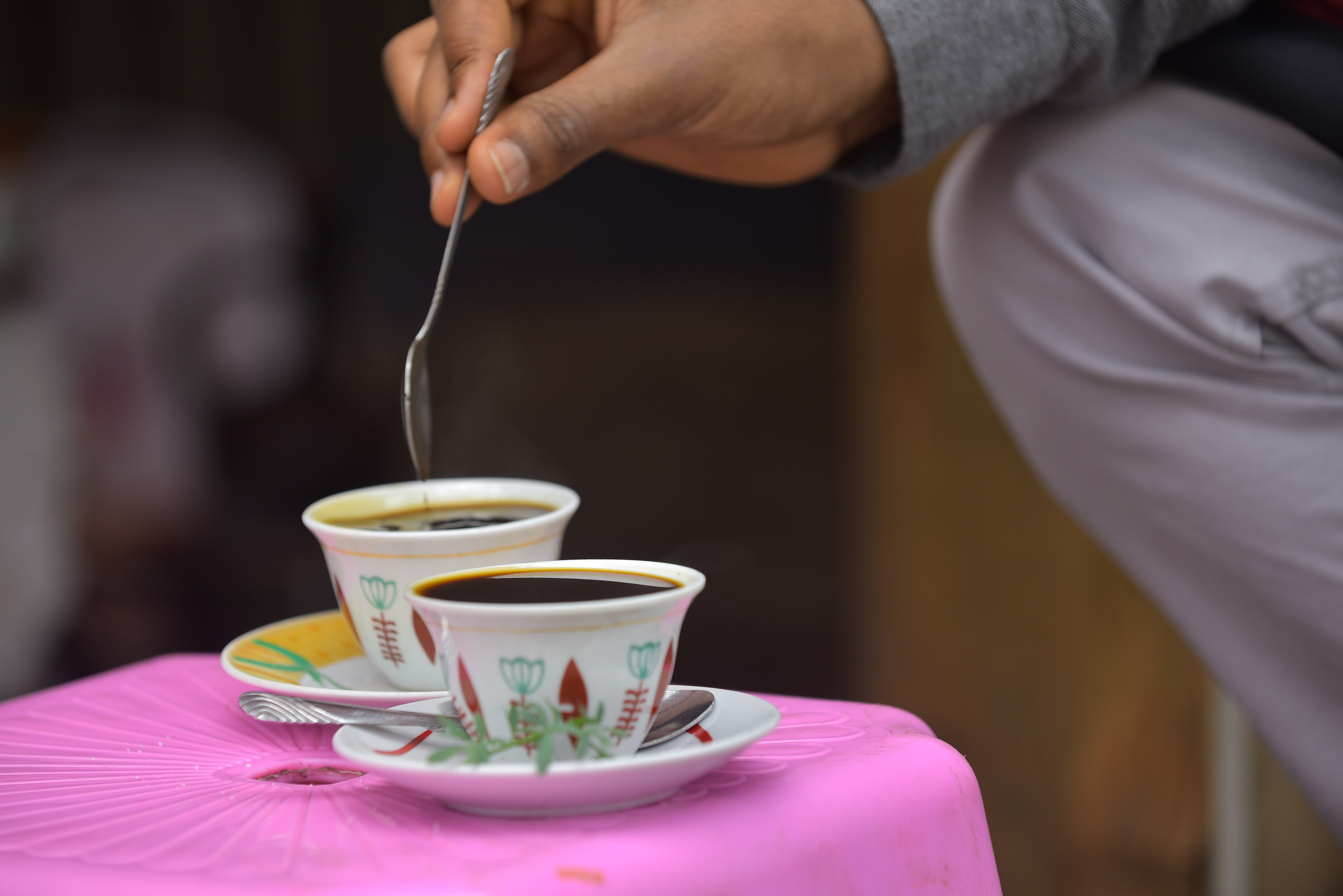 2021年5月14日,顾客在埃塞俄比亚亚的斯亚贝巴街头的咖啡摊品尝咖啡。新华社发(迈克尔·特韦尔德摄)