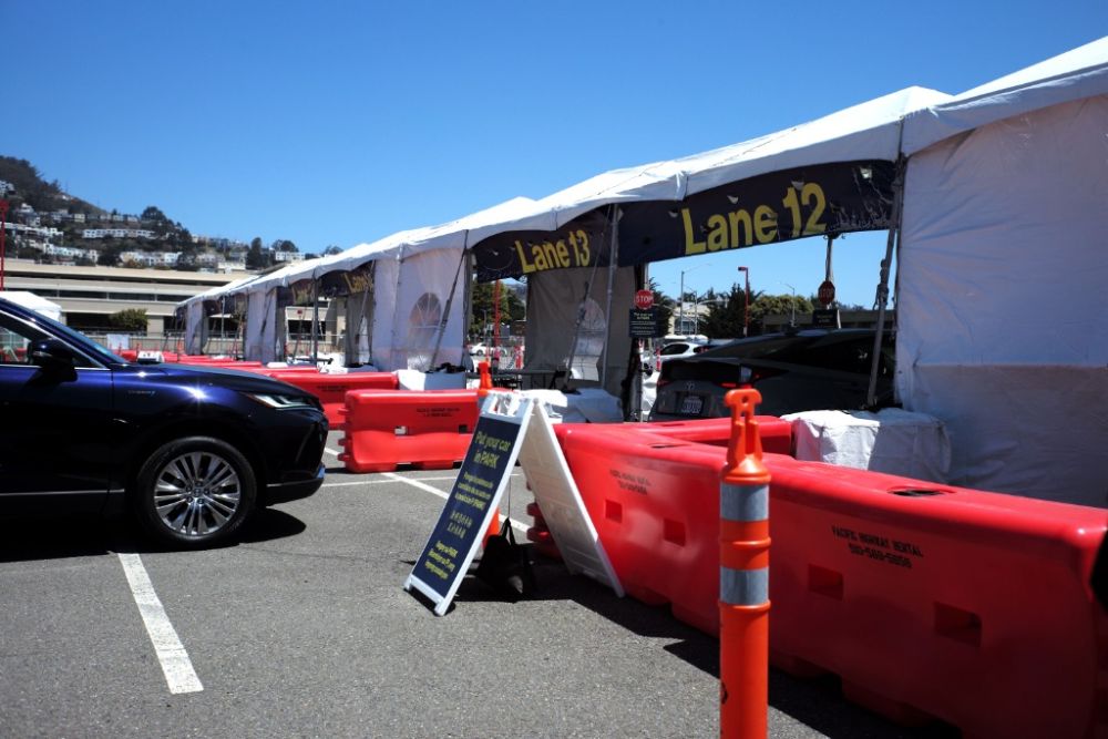 5月22日,在美国加利福尼亚州旧金山城市学院的新冠疫苗接种点,市民通过“得来速”的方式不下车接种疫苗。(新华社记者吴晓凌摄)