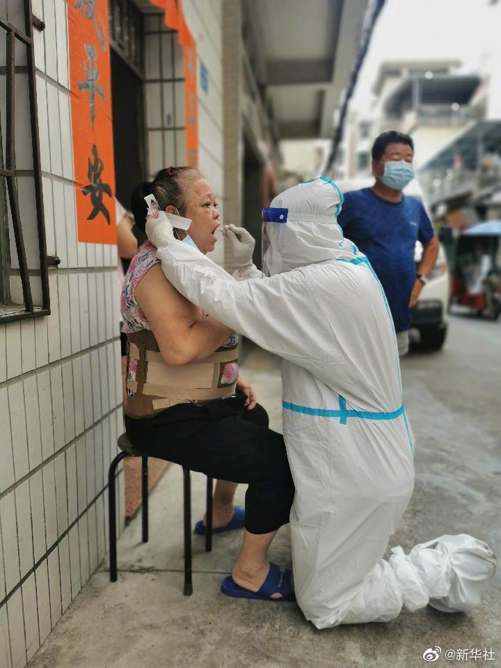 【大白跪姿为老人小孩做核酸】在广东多地启动的大规模核酸检测中,身着防护服的医务人员们不畏高温炎热,被人们亲切地称为“大白”。6月9日,东莞市虎门镇口腔科医生陈达峰在东方社区为行动不便的老人进行流动检测,为了让老人家舒服一点,他多次跪下来采集。6月7日,深圳市产科护士杨海萍为一名母亲怀抱中的孩子做核酸,她的姿势也是跪了下来。5月27日,广州市番禺区石楼镇社区卫生服务中心黎国伟在幼儿园采集咽拭子时,同样选择了跪下来以减少孩子们的呕吐反应。跪下来,降低了高度,增加了温度。“大白”们,谢谢你们,让老人孩子们被温柔以待。(记者田建川)