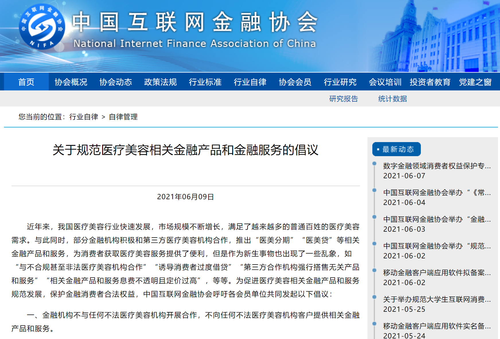 中国互联网金融协会9日发布关于规范医疗美容相关金融产品和金融服务的倡议。倡议内容包括,金融机构不与任何不法医疗美容机构开展合作,不向任何不法医疗美容机构客户提供相关金融产品和服务。