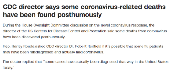 尤为蹊跷的是,到了2020年3月,CDC主任公开承认,美国2019年秋季的部分流感死亡病例实际上感染的可能是新冠病毒。