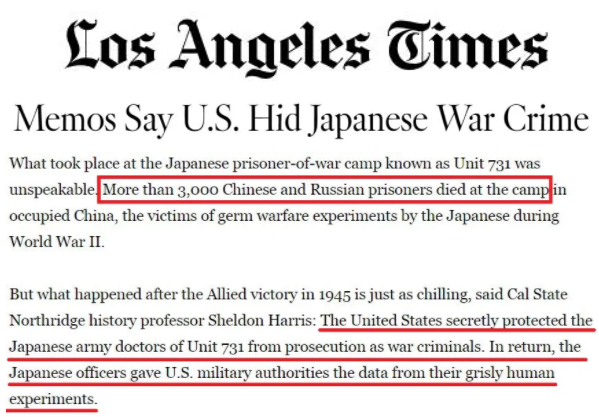 虽然有超过3000名中国人和苏联人死于二战期间的日本人细菌战实验,但是作为获取这些研究数据的回报,美国却选择秘密保护了731部队成员。