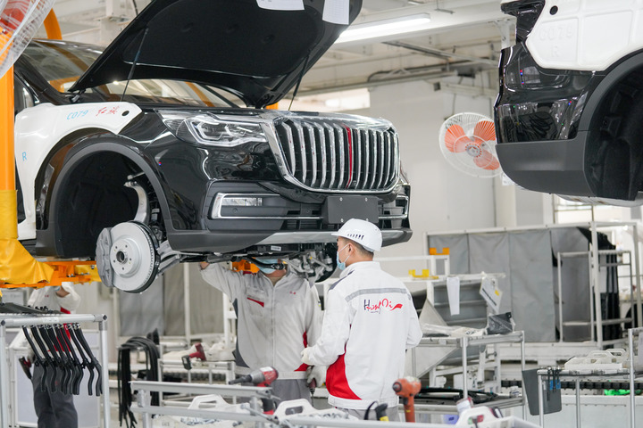 在位于吉林长春的一汽红旗工厂总装车间,工人在装配车辆(2021年4月28日摄)。新华社记者 颜麟蕴 摄