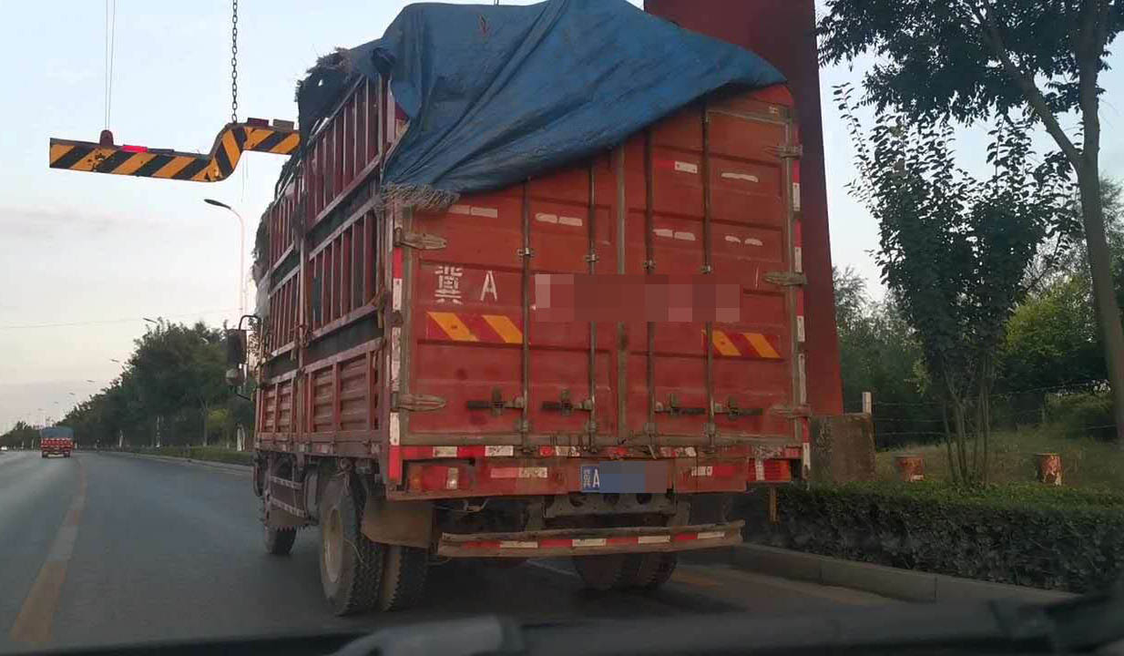 图为2020年9月河北石家庄市某处路段,大货车撞上限高杆。新华社记者舒静摄