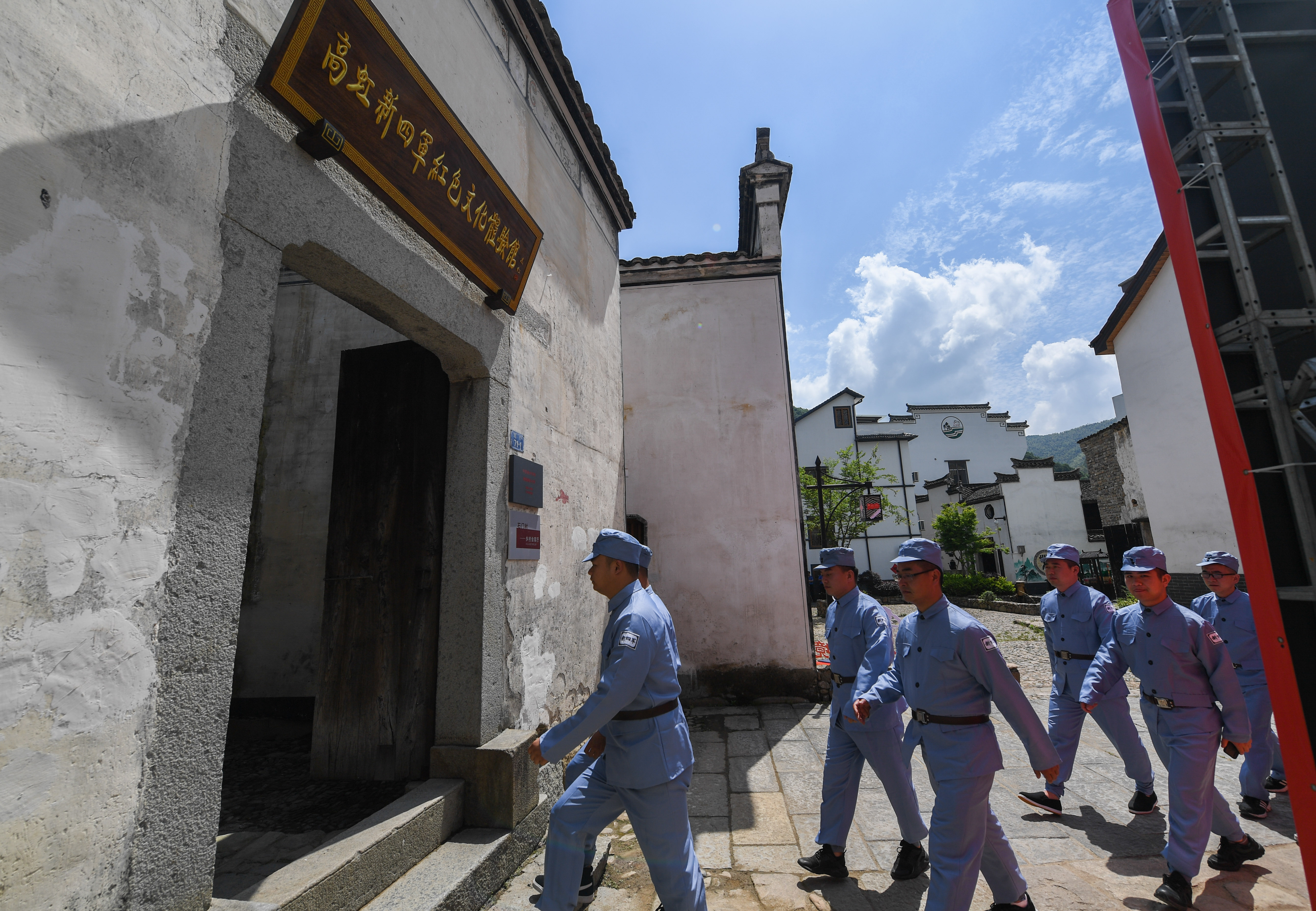 5月30日,参加党史教育和廉政教育的人员身着新四军主题服装进入高虹新四军红色文化体验馆。当日,位于浙江省杭州市临安区高虹镇的高虹新四军红色文化体验馆正式开馆。新华社记者 徐昱 摄